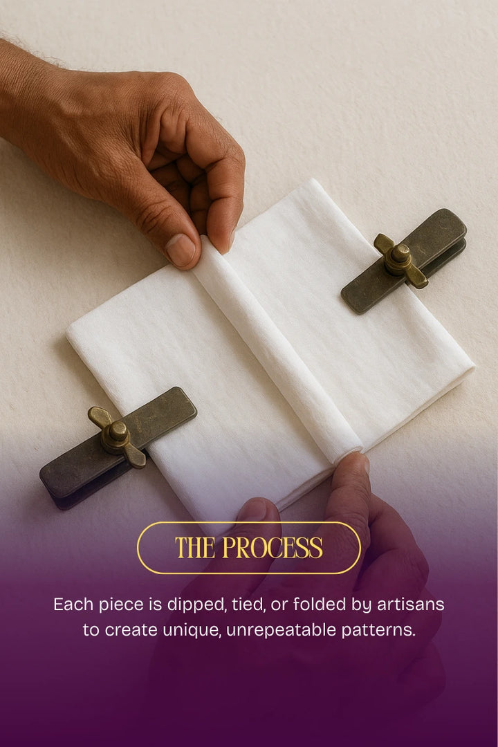 - Unfolding & Drying – Once dyed, the clamps are removed to reveal bold, unique patterns. The fabric is then dried naturally out on the fields.